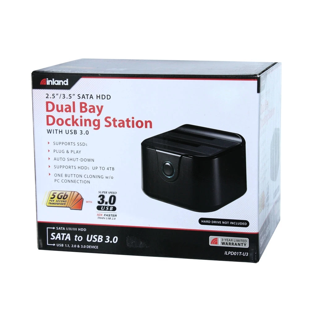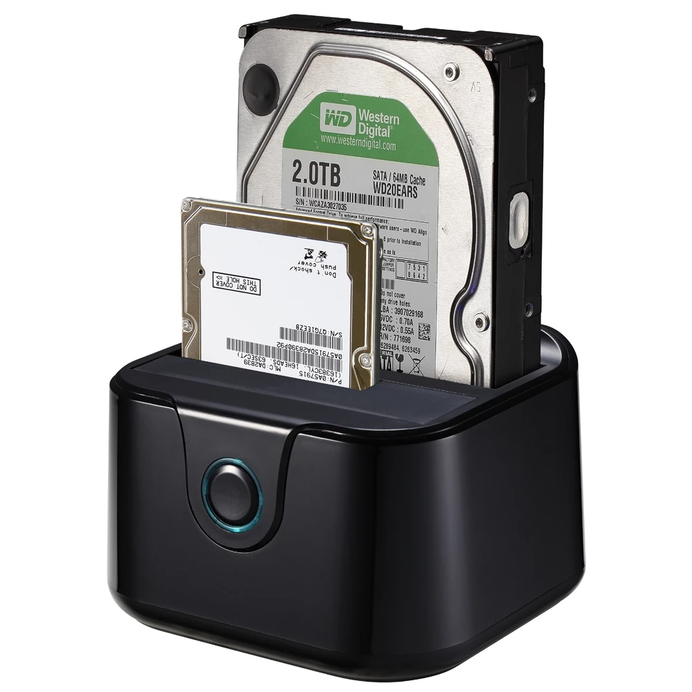 2.5/3.5″ Dual Bay Docking Station SATA enclosure (for 7mm-26.5mm SATA Drives); Low power consumption; Optimum hard disk cooling; High quality aluminum housing; Extremely silent while operating; Bus powered – AC adapter.