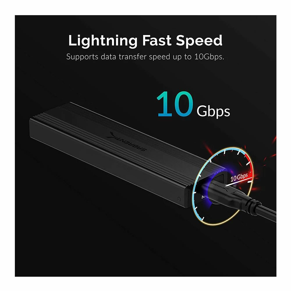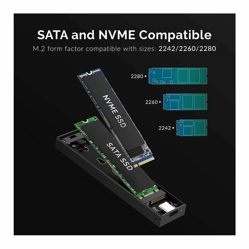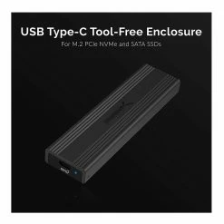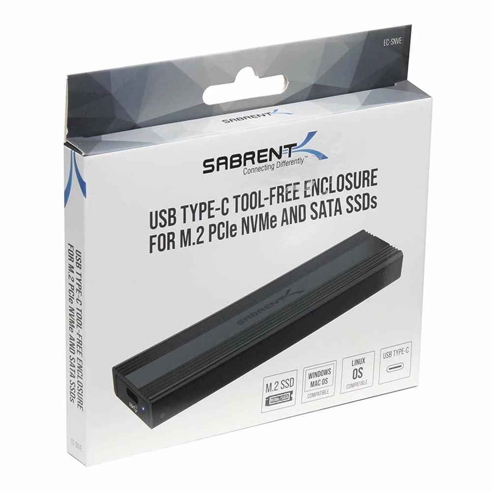 The Sabrent USB 3.2 Tool-Free Enclosure for M.2 PCIe NVMe and SATA SSDs are the perfect solutions for your enclosure needs!FEATURES:CONVENIENCE: 100% Tool-Free, quickly install and remove SSDs without any tools.DESIGN: Ultra-slim Aluminum case with ABS frame. Sleek, Durable, and Convenient. Portable yet durable, ideal for traveling.COMPATIBILITY: M.2 form factor compatible with both SATA and NVME in sizes: 2242/2260/2280.SPEED: USB 3.2 supports data transmission speeds of up to 10Gbps for steady and efficient data transfer. Backward compatible with USB 3.1 and USB 3.0 at respective speed limits.PLUG & PLAY: Ultra-fast 10Gbps throughput, low latency, and power efficiency. Perfect for tech nerds, 4K content designers, and engineers. At up to 1000MB/s, Data copy and transferring will be done in no time.